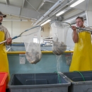 Daniel Gallegos (left) and Brandon Maes (right) net Gila trout during spawning at Mora National Fish Hatchery.