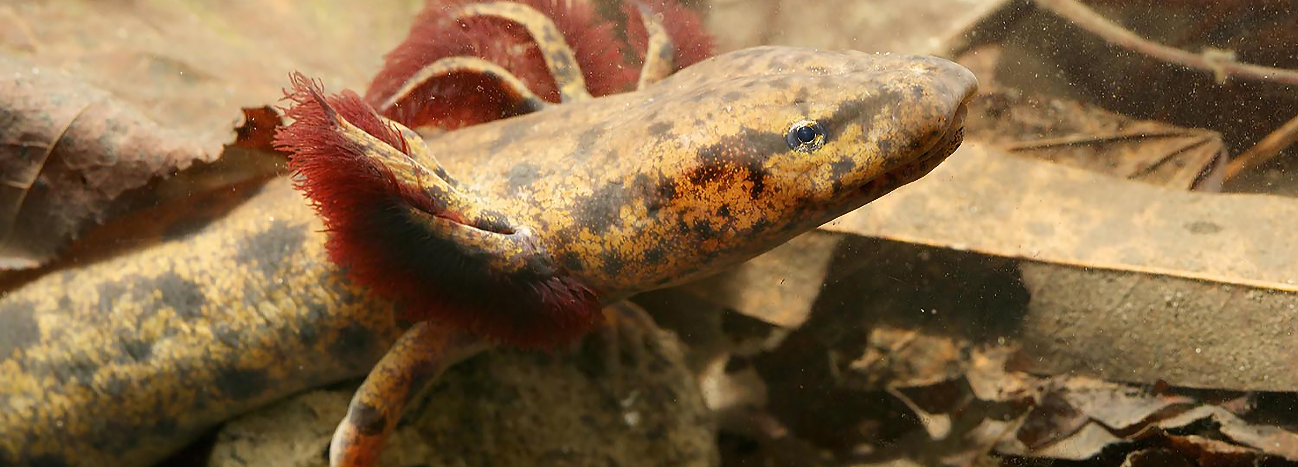 The Neuse River waterdog, Necturus lewisi, is a medium-sized newt, family Proteidae, found in two rivers of North Carolina. This partial view of the salamander showcases the cylindrical, flattened and elongate head with and a squared-off nose. Notice the three dark-red, feathery gills projecting from either side of the head. The dorsal coloration is a light rusty brownish, with the belly being a paler brown or grayish. There are roundish, dark brown or blackish spots on both the dorsal and ventral surfaces, and a dark line through the eye. The skin is smooth and slimy. Out of view are the lower torso, the laterally compressed tail and its hind feet. The limbs are rather small, and the front and hind feet have four toes each (unlike most salamanders, which have five toes on each hind foot).