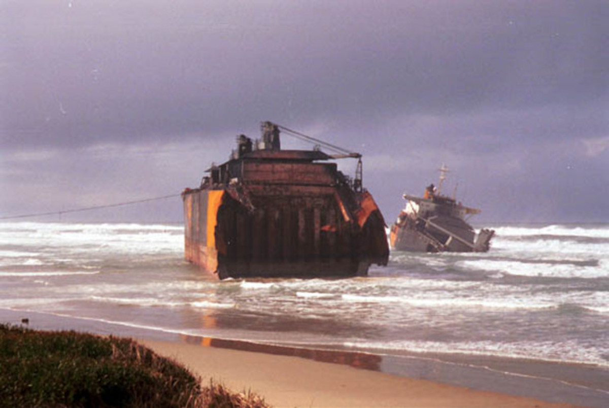 The grounded freighter New Carissa is broken in half as smoke and fire continues to burn. Navy demolition experts set the fire to burn the fuel which caused the ship to break into two off the Oregon coast (near Coos Bay).