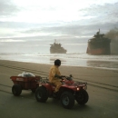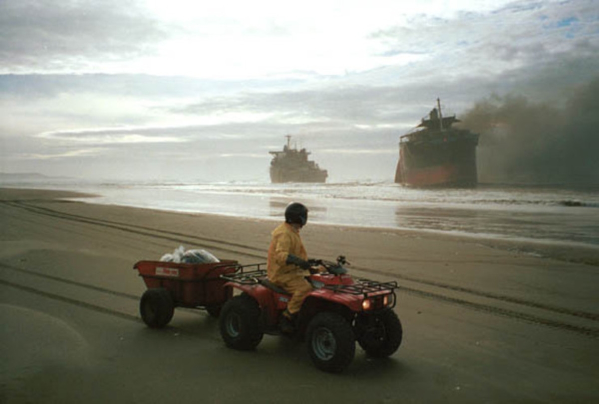 The grounded freighter New Carissa is broken in half as smoke and fire continues to burn. Navy demolition experts set the fire to burn the fuel which caused the ship to break into two off the Oregon coast (near Coos Bay).