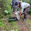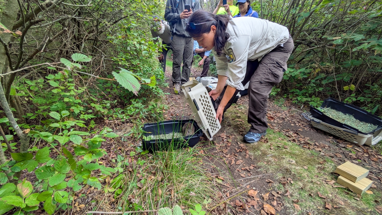 Refuge biologist Nancy Pau releases a New England Cottontail at Thacher Island NWR