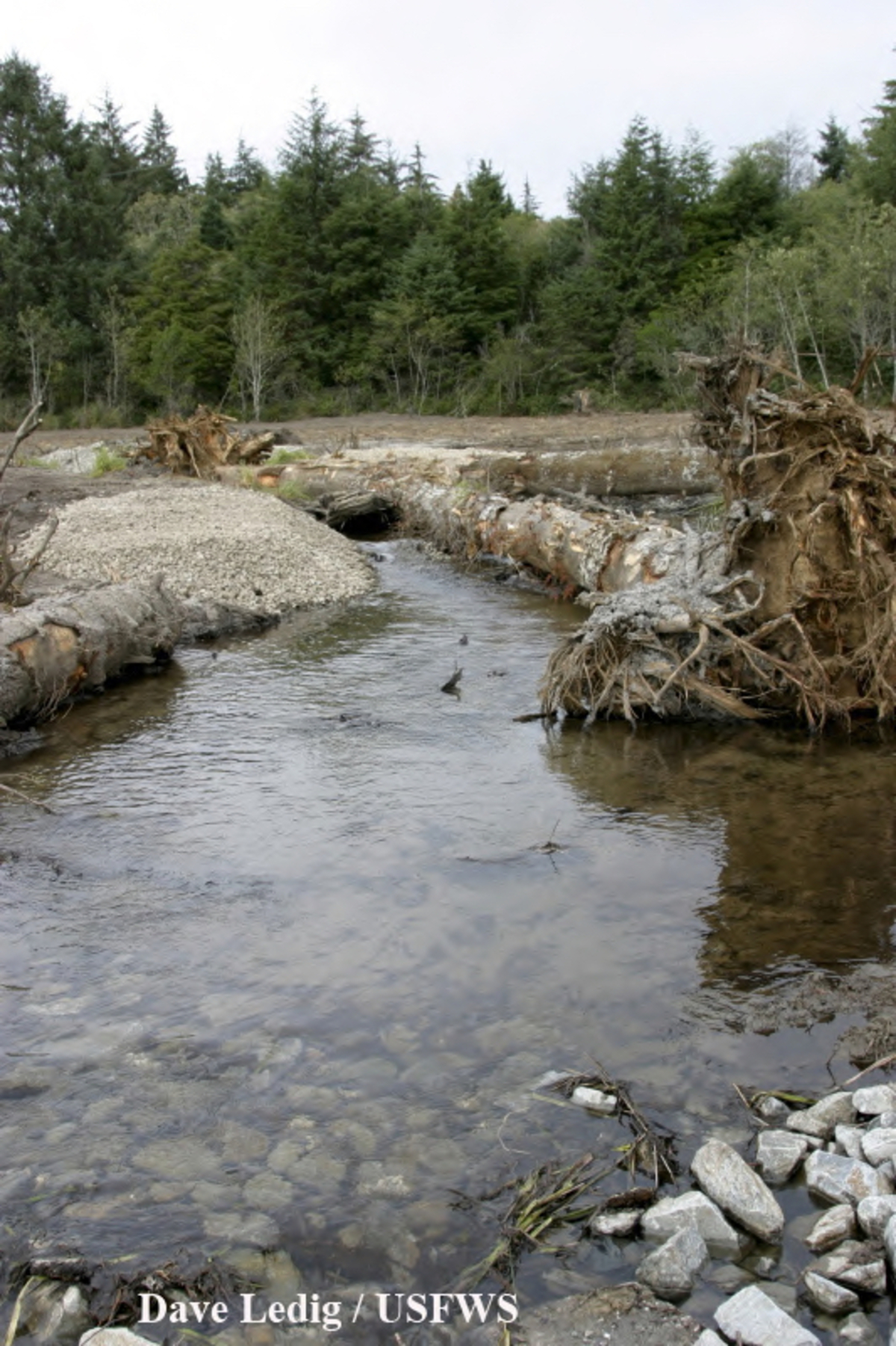 A segment of the new meandering channel of Fahys Creek constructed through the Smith Tract. Large woody debris and gravel was placed all along the new stream channel to diversify habitat and stream substrate. Piles of gravel were placed along the stream banks to serves as source material over the next decade. Image taken from USFWS Pacific Region Flickr page.