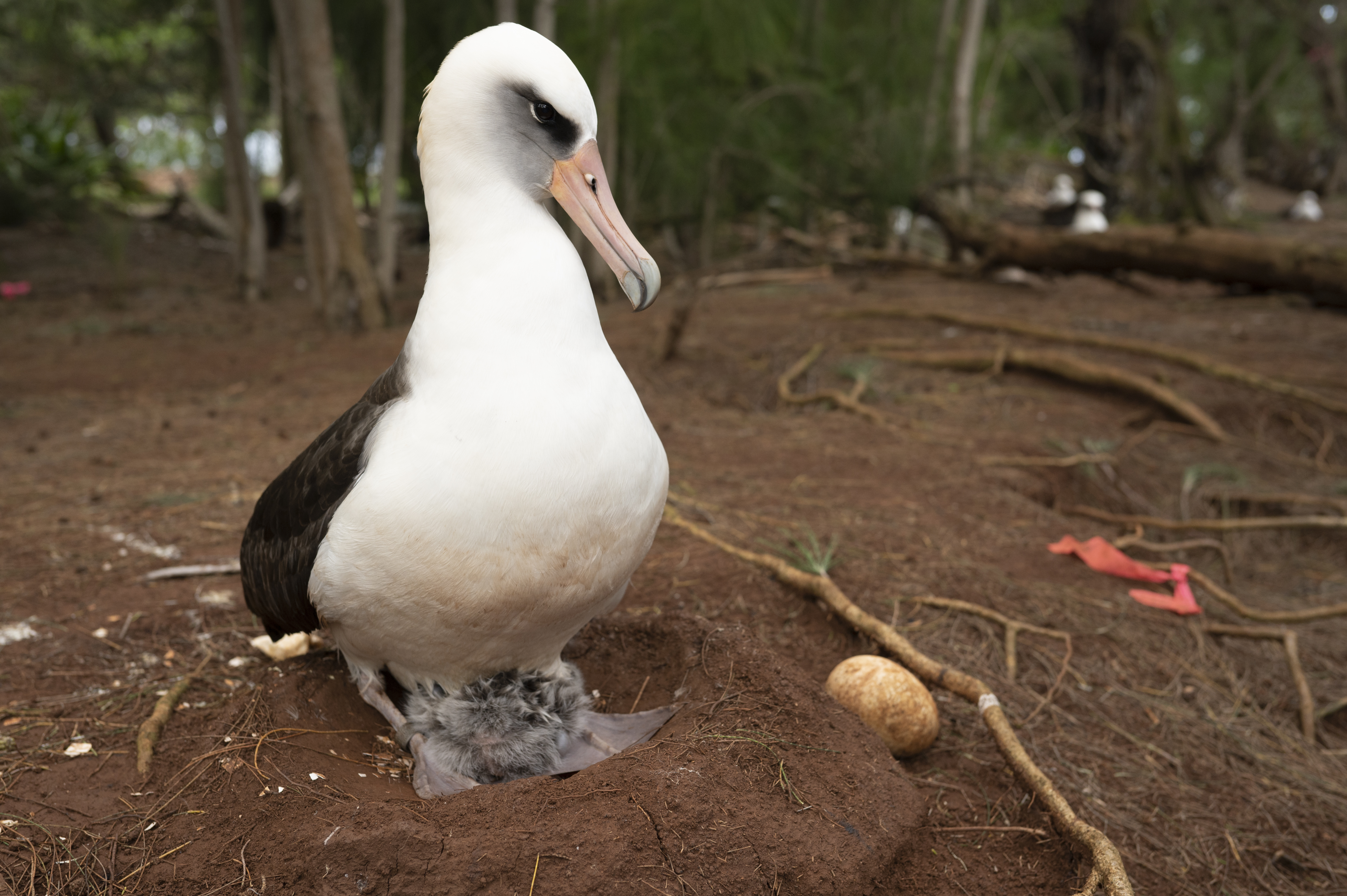 A female mōlī or Laysan albatross sits on her newly hatched chick at Kīlauea Point National Wildlife Refuge. The unhatched egg outside of the nest indicates that she is part of a female-female pair and both birds laid an egg and one was pushed from the nest.