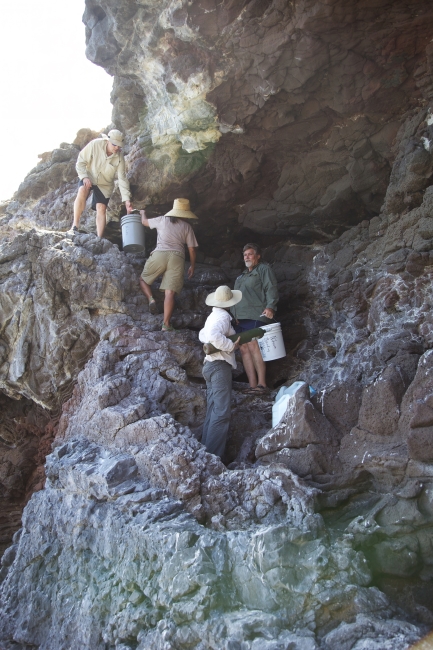 The Nihoa millerbird is a tiny land bird measuring approximately 5 inches in length that was discovered on the island of Nihoa in 1923. Another subspecies once occurred on Laysan Island, where it went extinct in the early 20th century after the island was devegetated by introduced rabbits. It has dark gray-brown feathers above, a buffy-white belly, and a thin dark colored bill. This bird got its name because its favorite food is the miller moth. Male and female birds are similar looking. Nihoa Millerbird team prepares to leave island