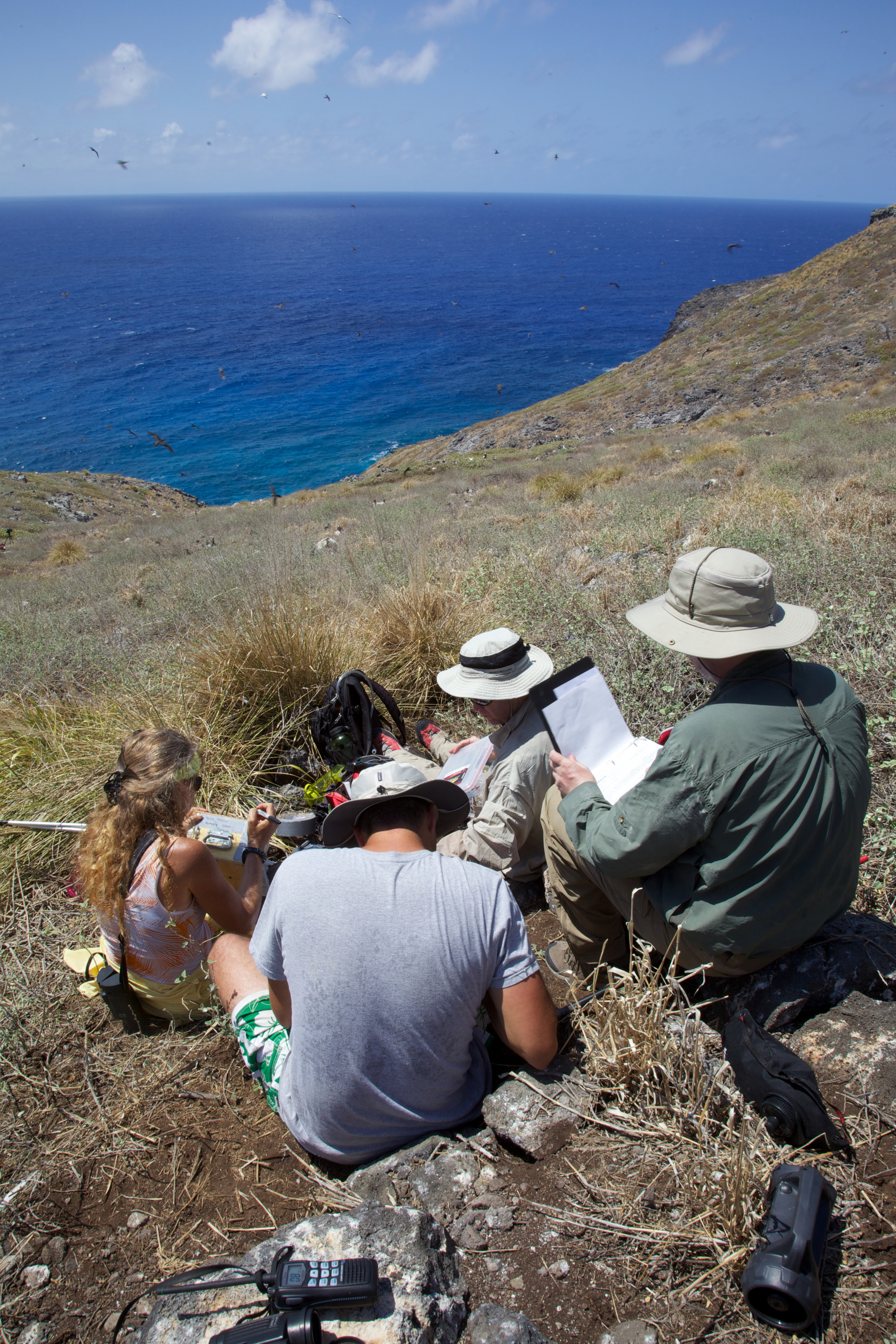 The Nihoa millerbird is a tiny land bird measuring approximately 5 inches in length that was discovered on the island of Nihoa in 1923. Another subspecies once occurred on Laysan Island, where it went extinct in the early 20th century after the island was devegetated by introduced rabbits. It has dark gray-brown feathers above, a buffy-white belly, and a thin dark colored bill. This bird got its name because its favorite food is the miller moth. Male and female birds are similar looking. Field Team studies Nihoa Millerbird.
