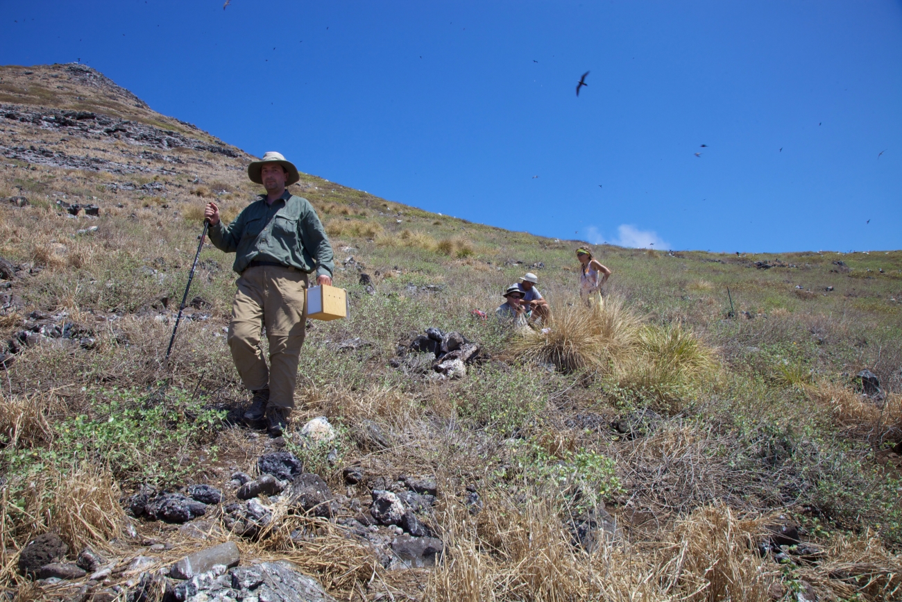 Field Team studies Nihoa Millerbird. The Nihoa Millerbird is a tiny land bird measuring approximately 5 inches in length that was discovered on the island of Nihoa in 1923. Another subspecies once occurred on Laysan Island, where it went extinct in the early 20th century after the island was devegetated by introduced rabbits. It has dark gray-brown feathers above, a buffy-white belly, and a thin dark colored bill. This bird got its name because its favorite food is the miller moth. Male and female birds are similar looking.