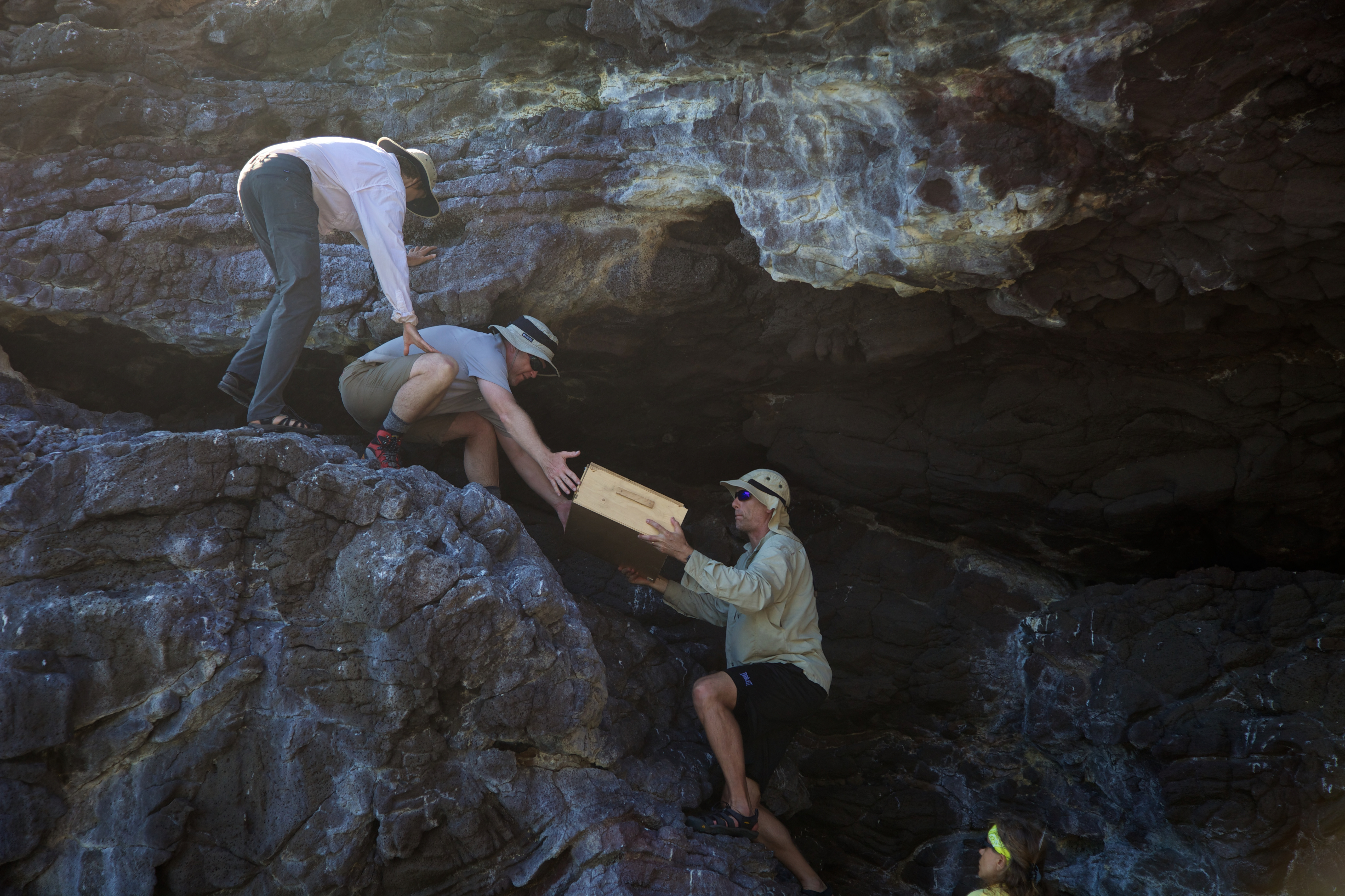 Nihoa Millerbird team safely transports Millerbirds off of Nihoa Island. The Nihoa Millerbird is a tiny land bird that was discovered on the island of Nihoa in 1923. Another subspecies once occurred on Laysan Island, where it went extinct in the early 20th century after the island was devegetated by introduced rabbits. It has dark gray-brown feathers above, a fuffy-white belly, and a thin dark colored bill. This bird got its name because its favorite food is the miller moth. Male and female birds are similar looking. They have a metallic and bubbling voice.