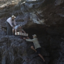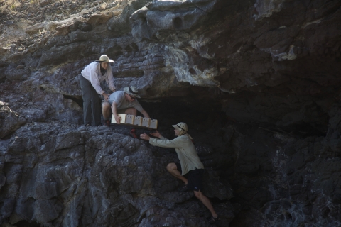 Nihoa Millerbird team safely transports Millerbirds off of Nihoa Island. The Nihoa Millerbird is a tiny land bird that was discovered on the island of Nihoa in 1923. Another subspecies once occurred on Laysan Island, where it went extinct in the early 20th century after the island was devegetated by introduced rabbits. It has dark gray-brown feathers above, a fluffy-white belly, and a thin dark colored bill. This bird got its name because its favorite food is the miller moth. Male and female birds are similar looking. They have a metallic and bubbling voice.