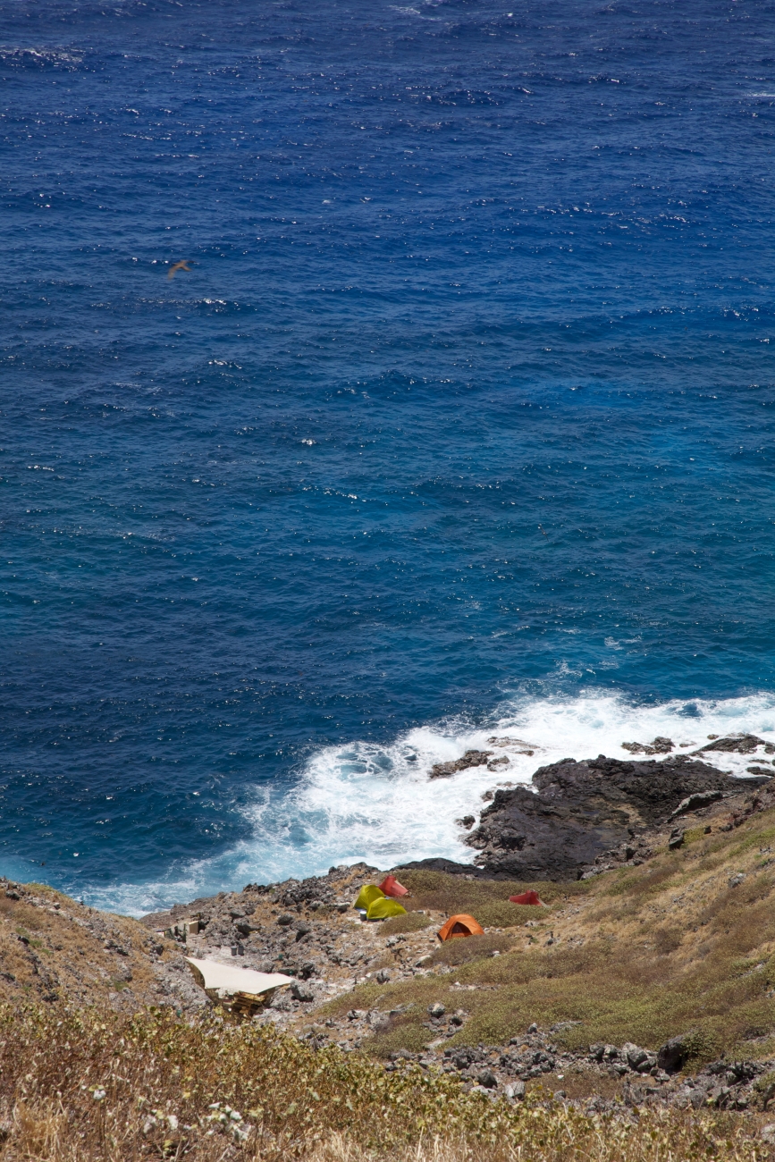 Base Camp on Nihoa. The Nihoa Millerbird is a tiny land bird that was discovered on the island of Nihoa in 1923. Another subspecies once occurred on Laysan Island, where it went extinct in the early 20th century after the island was devegetated by introduced rabbits. It has dark gray-brown feathers above, a buffy-white belly, and a thin dark colored bill. This bird got its name because its favorite food is the miller moth. Male and female birds are similar looking. They hves a metallic and bubbling voice.