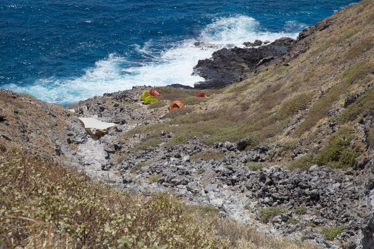 Base Camp on Nihoa. The Nihoa Millerbird is a tiny land bird that was discovered on the island of Nihoa in 1923. Another subspecies once occurred on Laysan Island, where it went extinct in the early 20th century after the island was devegetated by introduced rabbits. It has dark gray-brown feathers above, a fluffy-white belly, and a thin dark colored bill. This bird got its name because its favorite food is the miller moth. Male and female birds are similar looking. They have a metallic and bubbling voice.