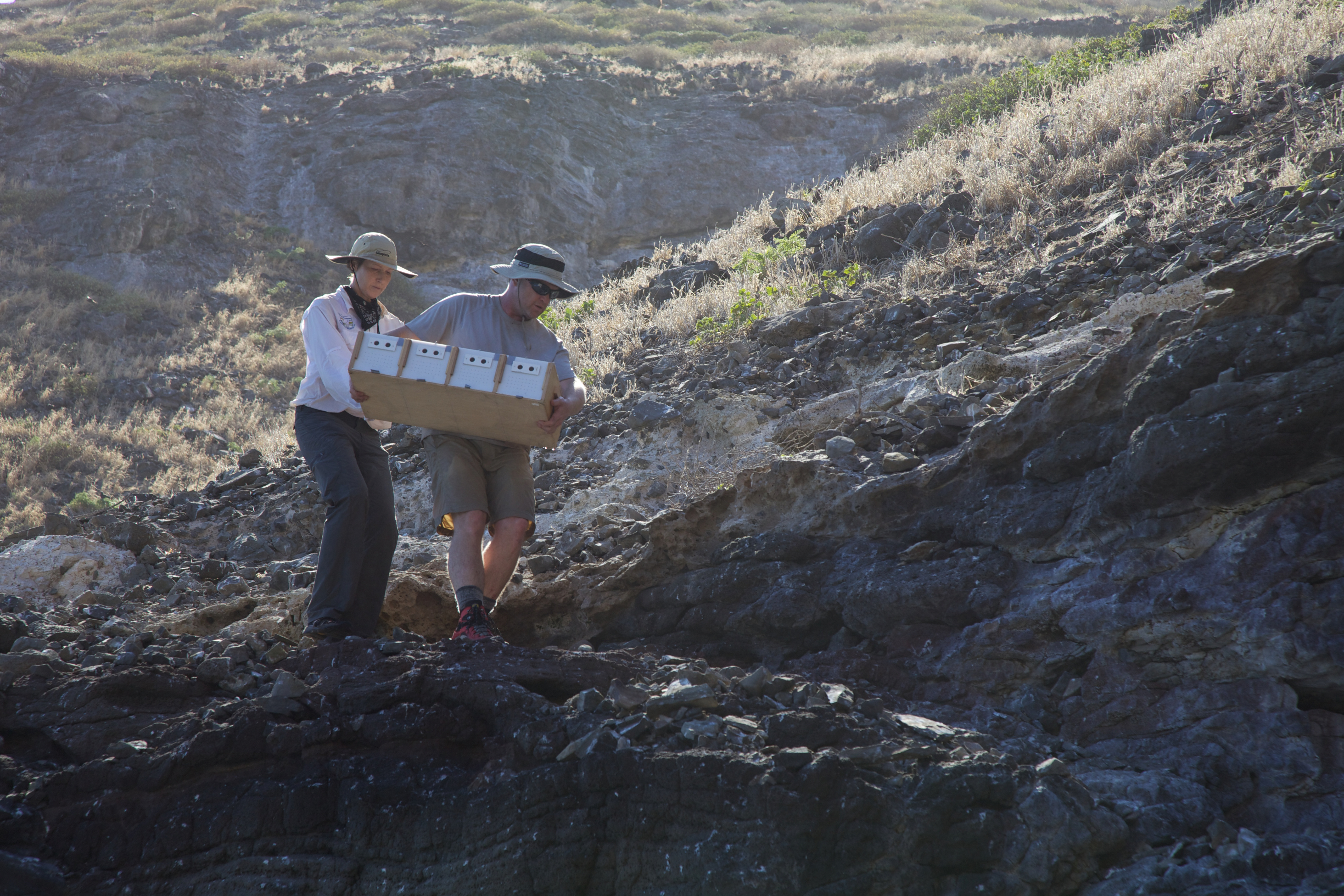 Nihoa Millerbird team safely transports Millerbirds off of Nihoa Island. The Nihoa Millerbird is a tiny land bird measuring approximately 5 inches in length that was discovered on the island of Nihoa in 1923. Another subspecies once occurred on Laysan Island, where it went extinct in the early 20th century after the island was devegetated by introduced rabbits. It has dark gray-brown feathers above, a buffy-white belly, and a thin dark colored bill. This bird got its name because its favorite food is the miller moth. Male and female birds are similar looking.
