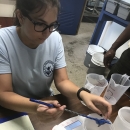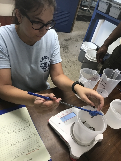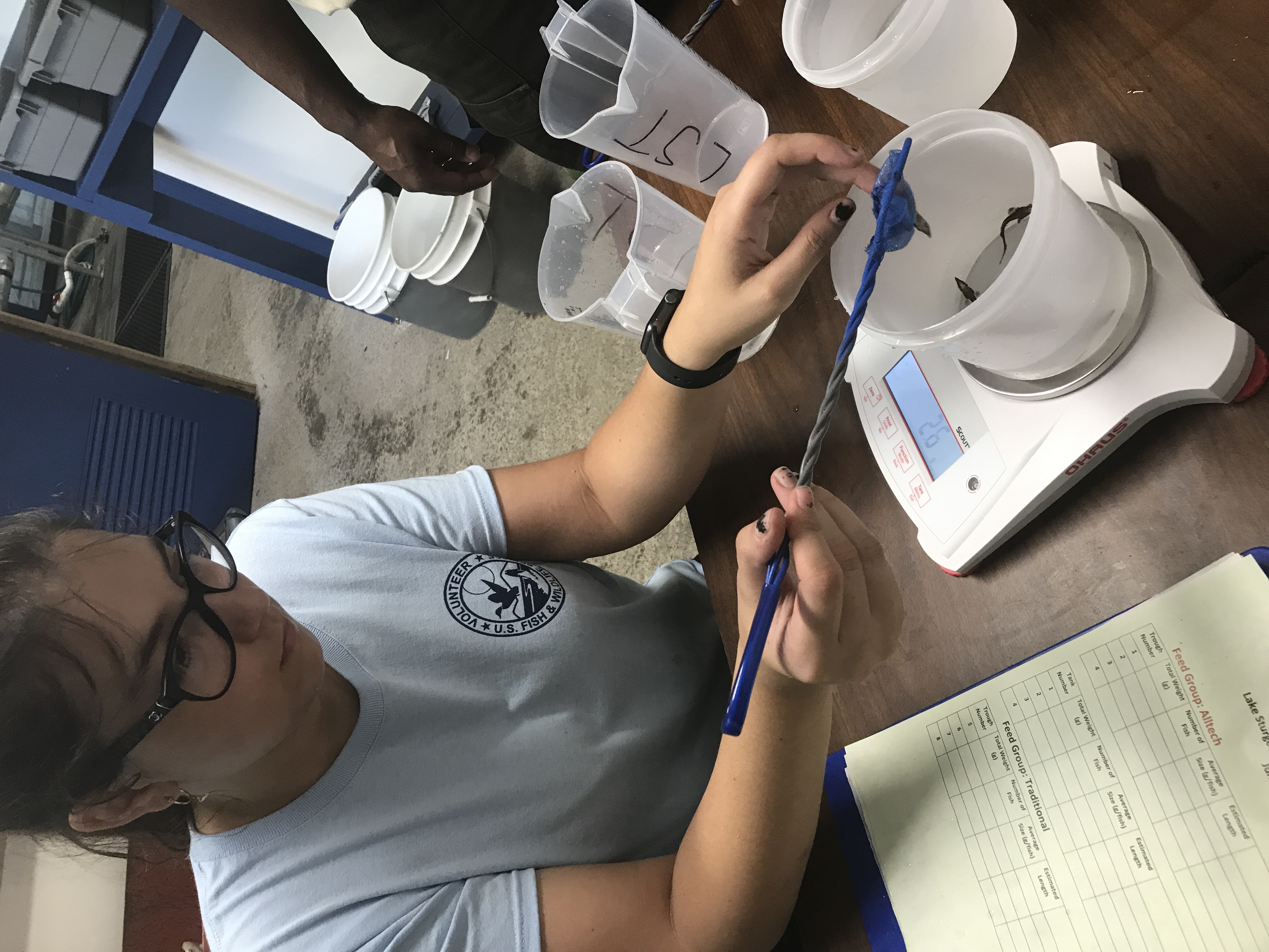 Niva Hoffman, Edenton National Fish Hatchery Volunteer, weighs young Lake Sturgeon to monitor growth.