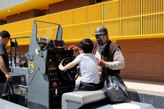 David Dominguez of the Lodi Fish and Wildlife Office shows a youngster how to drive Zeus, the FWO’s electrofishing boat, during the NorCal Science Festival. Photo by Brandon Honig/USFWS