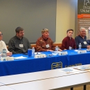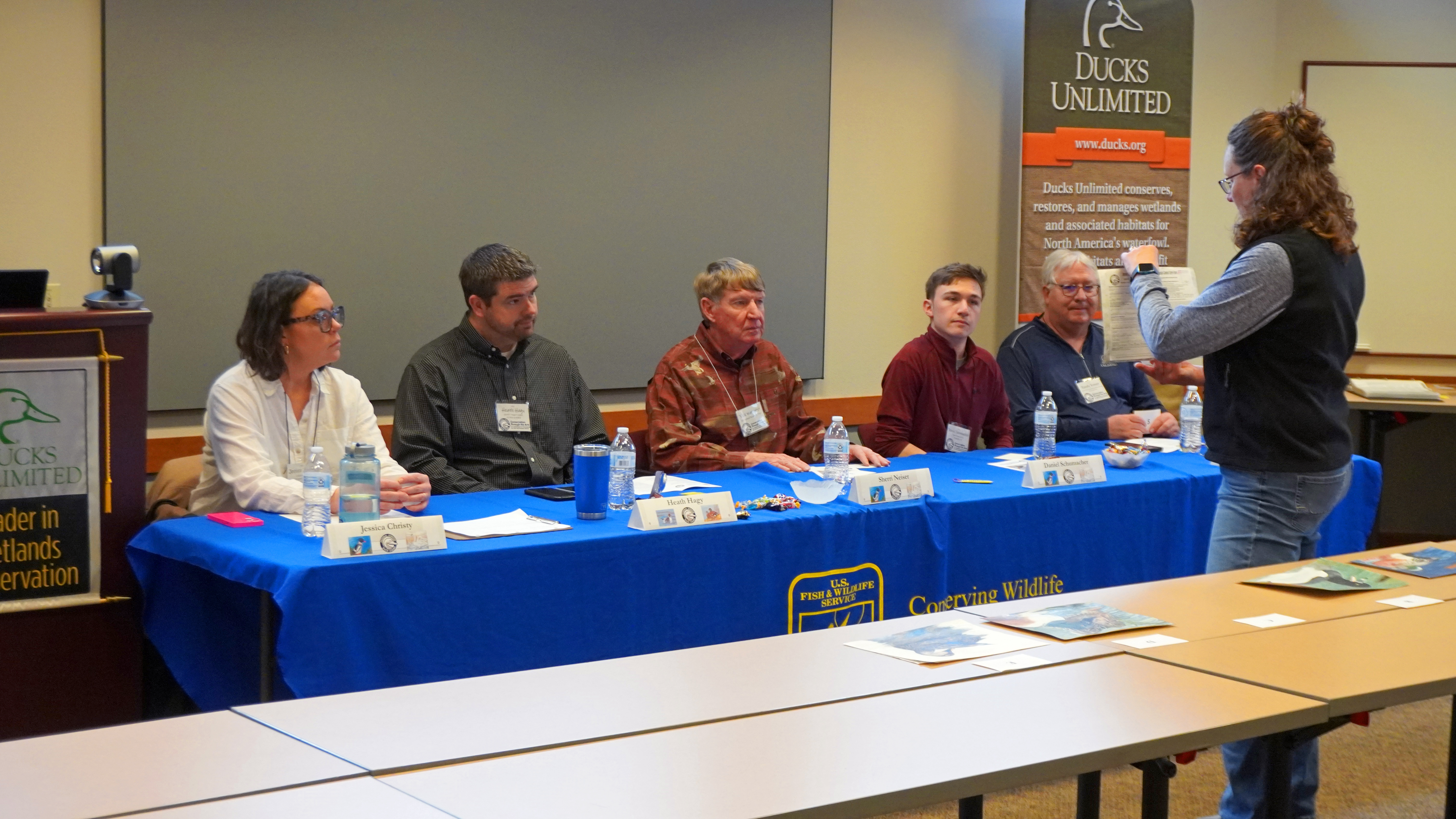 A representative shows a junior duck stamp artwork entry to the five judges in Bismark, ND, in March 2025.