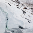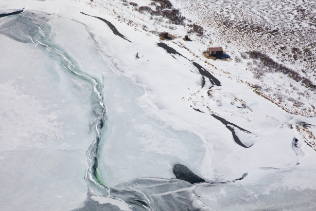 North Frazer Lake with snow covered mountains. Aerial view of a public use cabin and out buildings at Kodiak NWR in Alaska.