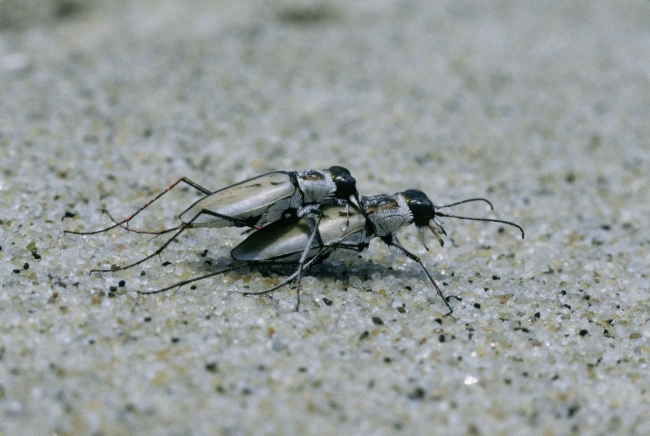 Two northeastern tiger beetles on the beach. For more information on the status of the northeastern tiger beetle visit: http://ecos.fws.gov/species_profile/SpeciesProfile?spcode=I02D