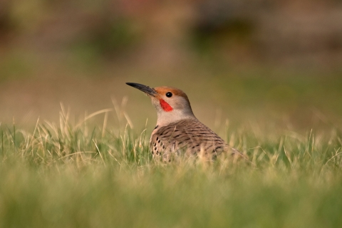 Northern Flickers are large, brown woodpeckers with a gentle expression and handsome black-scalloped plumage.