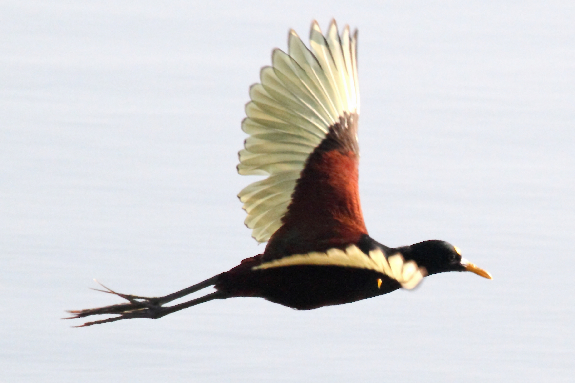 Northern Jacana in flight. These birds have been named "lily-trotters." Location: Choke Canyon State Park, Texas.