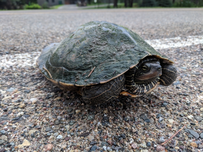 We found this northern map turtle crossing the road and helped it reach its destination safely.