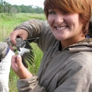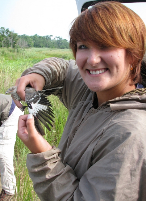 Forsythe intern bird banding Northern Mockingbird at the Wildlife Drive at Edwin B. Forsythe NWR