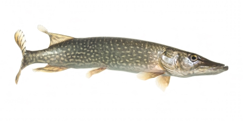 Northern pike have a very long, slender body. Most easily distinguished by the long head and snout, which is filled with many long, sharp teeth, and placement of the dorsal fun back near the tail. Color of the fish is usually green with many lighter spots on the sides and a whitish belly. The eyes are bright yellow.