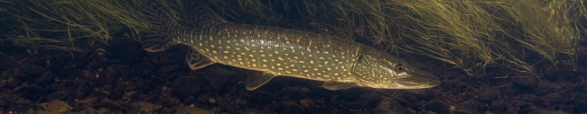 Northern pike have a very long, slender body. Most easily distinguished by the long head and snout, which is filled with many long, sharp teeth, and placement of the dorsal fun back near the tail. Color of the fish is usually green with many lighter spots on the sides and a whitish belly. The eyes are bright yellow.