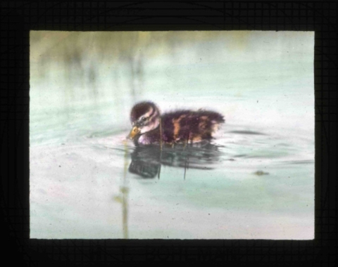Hand painted glass slide of a young Northern Pintail, taken by Finley and Bohlman at Malheur Lake during a photography trip to the area in 1908. Finley and Bohlman's work of the area in 1908 would later help Malheur become a bird refuge in 1908.