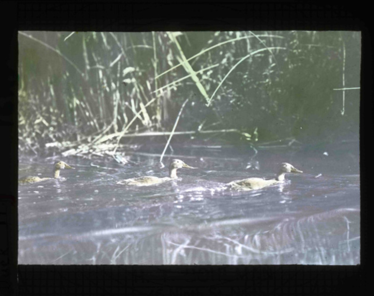 Hand painted glass slide of Northern Pintails in Malheur Lake taken by Finley and Bohlman during a 1908 photography trip to the area that would later help Malheur become a bird refuge in 1908.