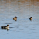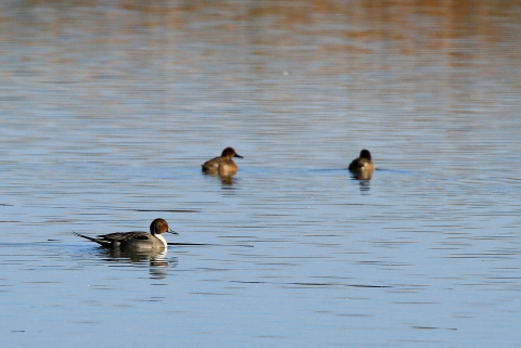 Northern pintails are long-necked ducks, males have a very long tail, a white breast, and white neck stripe.