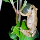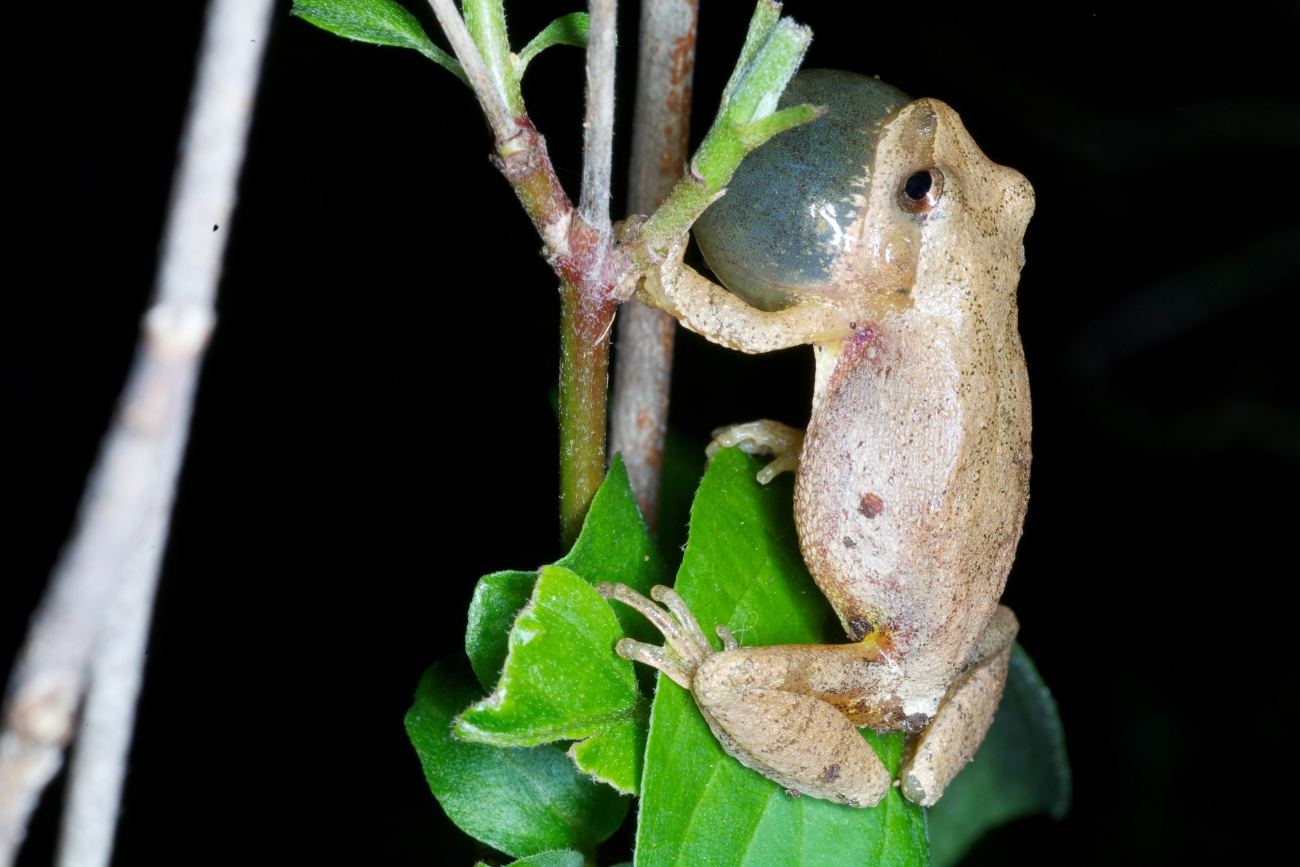 Northern Spring Peeper with throat puffed out on a leafy branch.