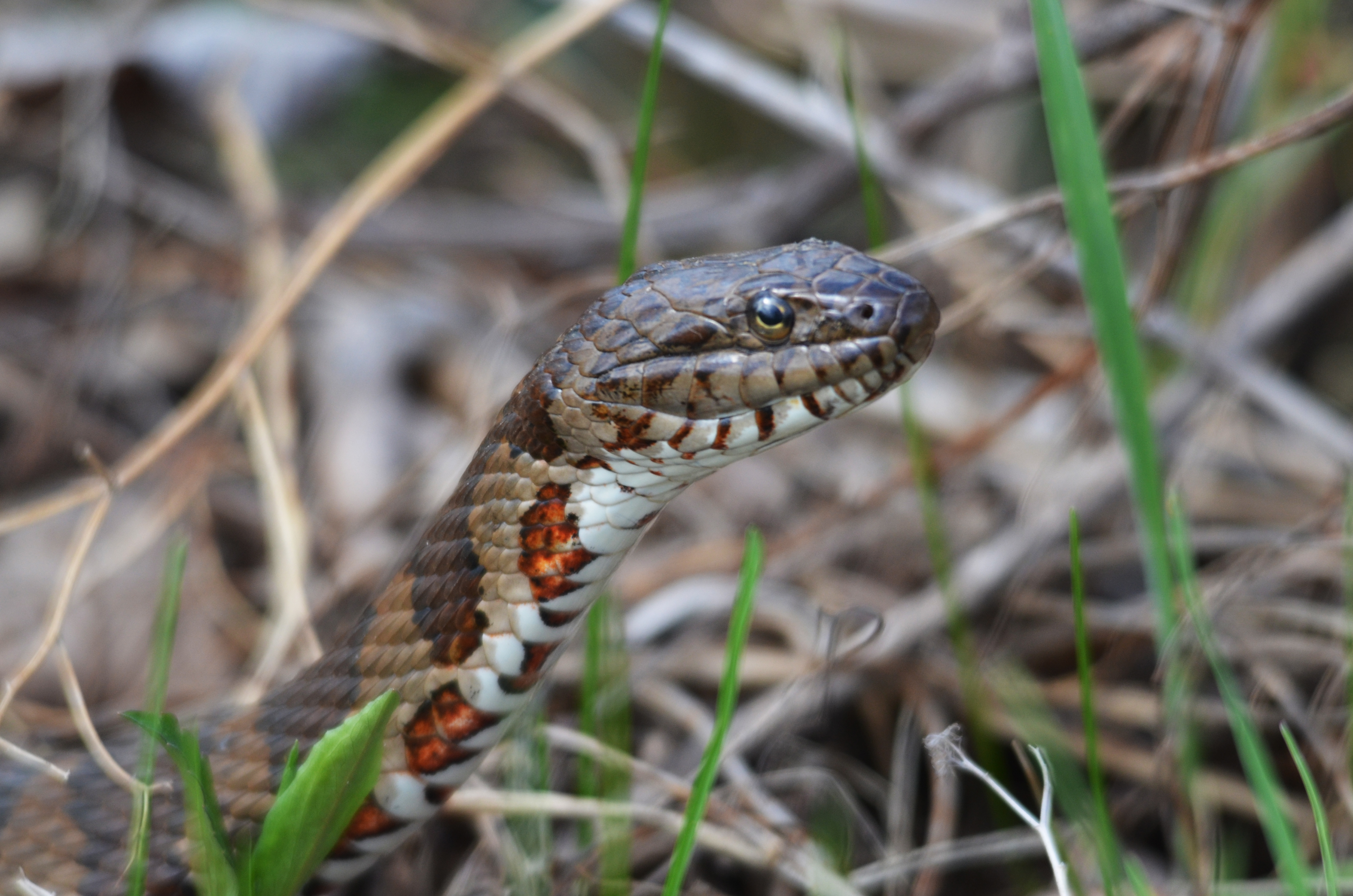 This stunning northern water snake was soaking up the sun along a roadside. While this species is nonvenomous, it will bite repeatedly in self defense if picked up.