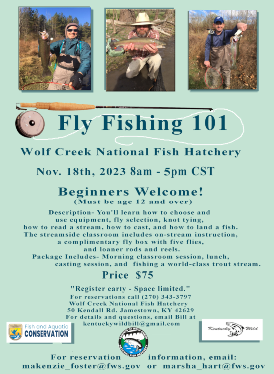 The Fly Fishing 101 Workshop flyer for November 2023 led by professional hunting/fishing guide Bill Carman at Wolf Creek National Fish Hatchery.
