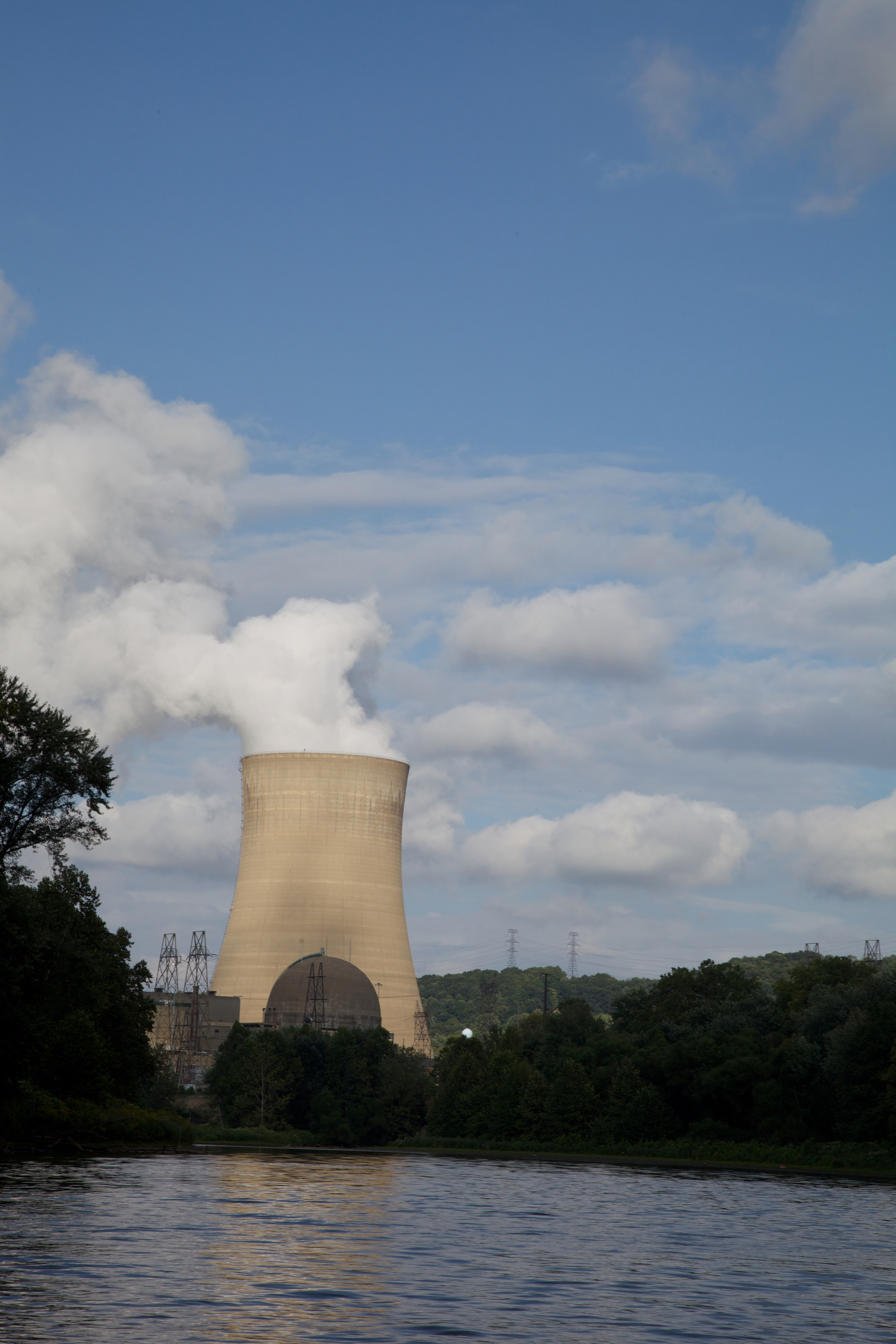 A river front view of a Nuclear Power Plant smoke stack from a boat on the Ohio River.