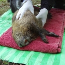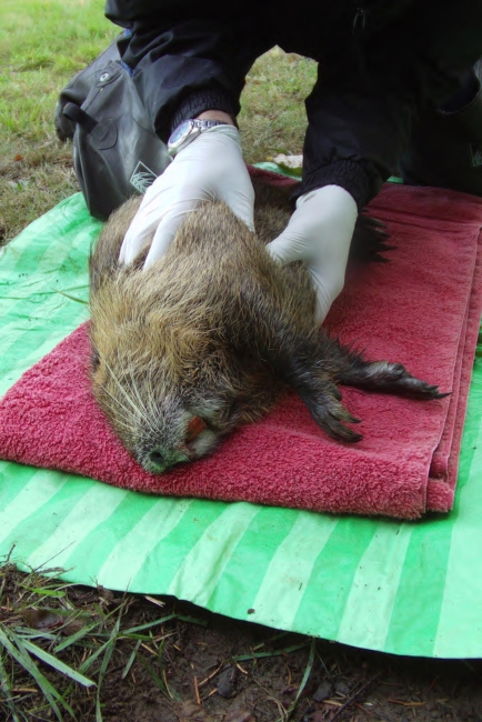 A nutria is given a health exam before being tagged. Tagging the animals will help biologists to better understand nutria and prevent their spreading. Image taken from USFWS Pacific Region Flickr page.