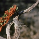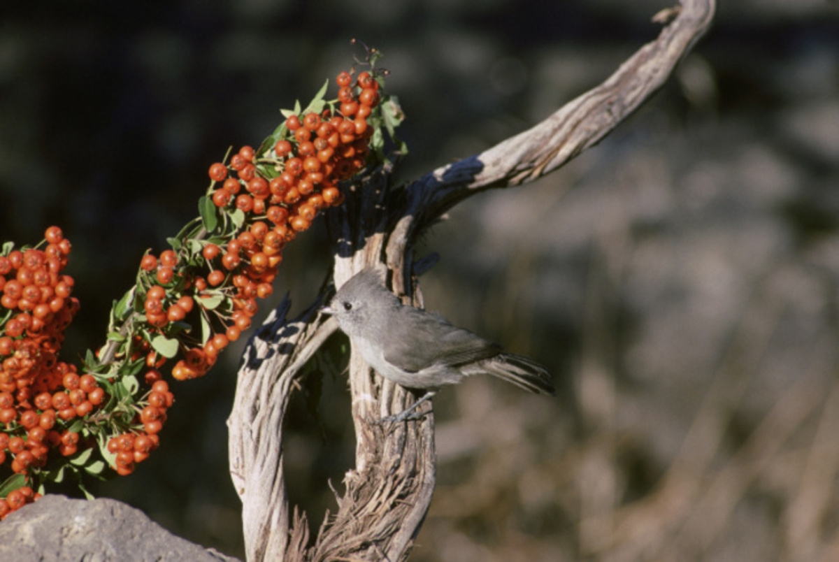 Close view of bird sitting on dead branch with red berries nearby in Siskiyou County.