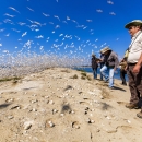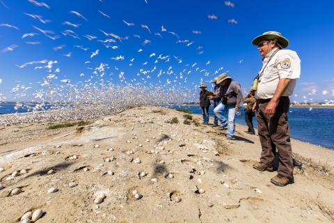 A U.S. Fish and Wildlife employee with Observing flock of Elegant terns