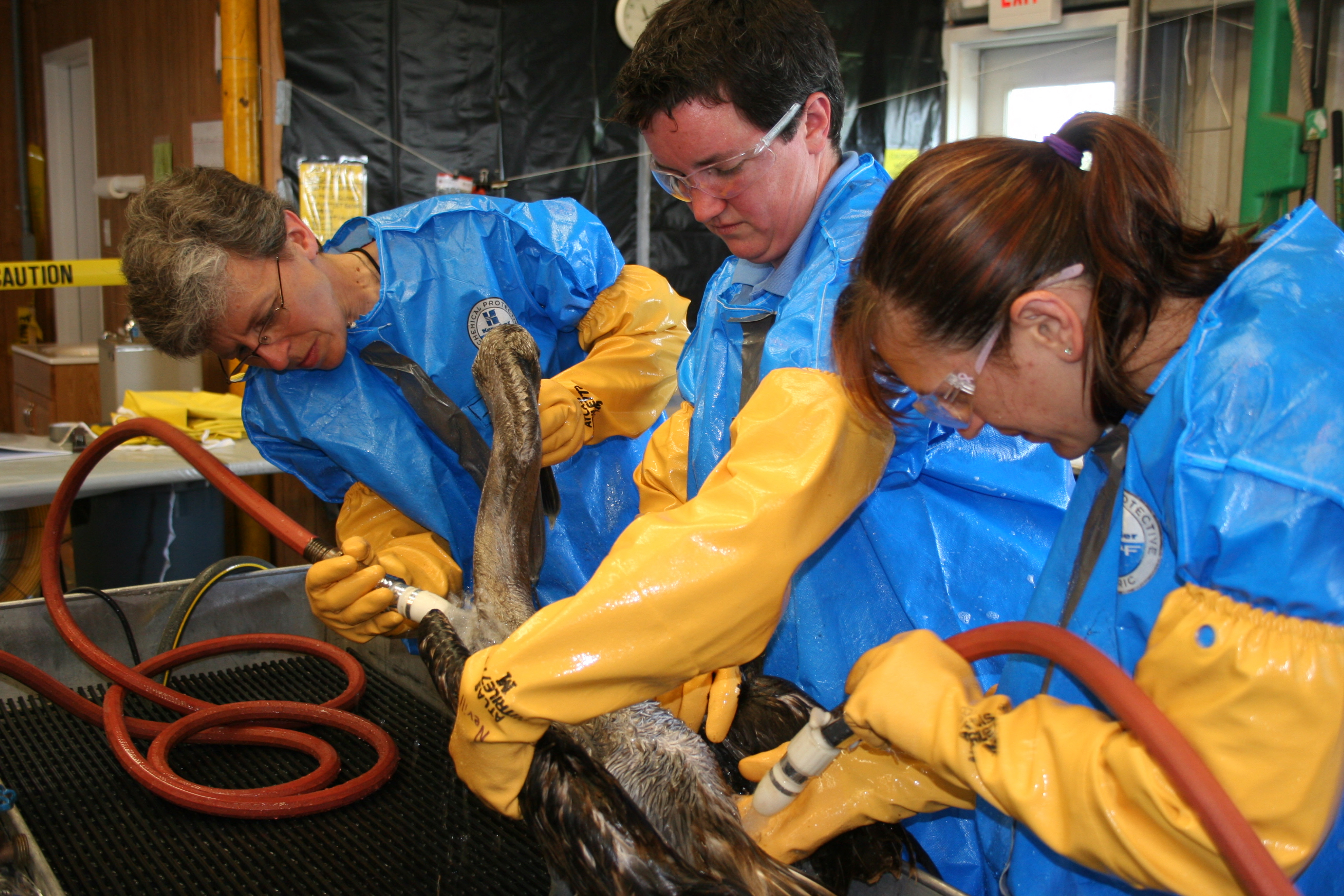 Oil impacted Brown pelican is being cleaned at a Wildlife Rehabilitation center in Plaquemines Parish, Louisiana.