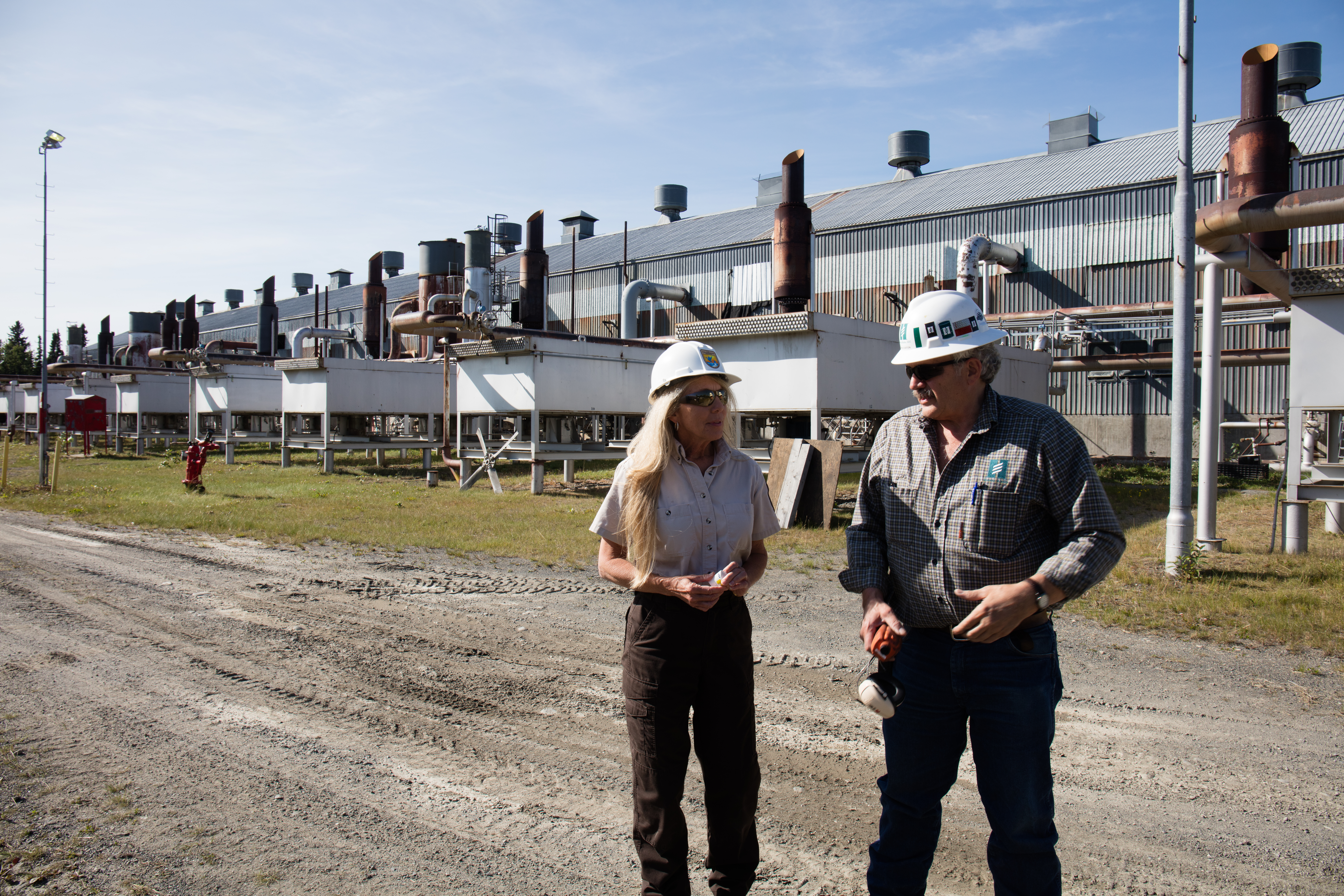 A Fish and Wildlife Service employee, left, confers with an oil industry site supervisor alongside industry oil extraction infrastructure at Kenai National Wildlife Refuge in Alaska.