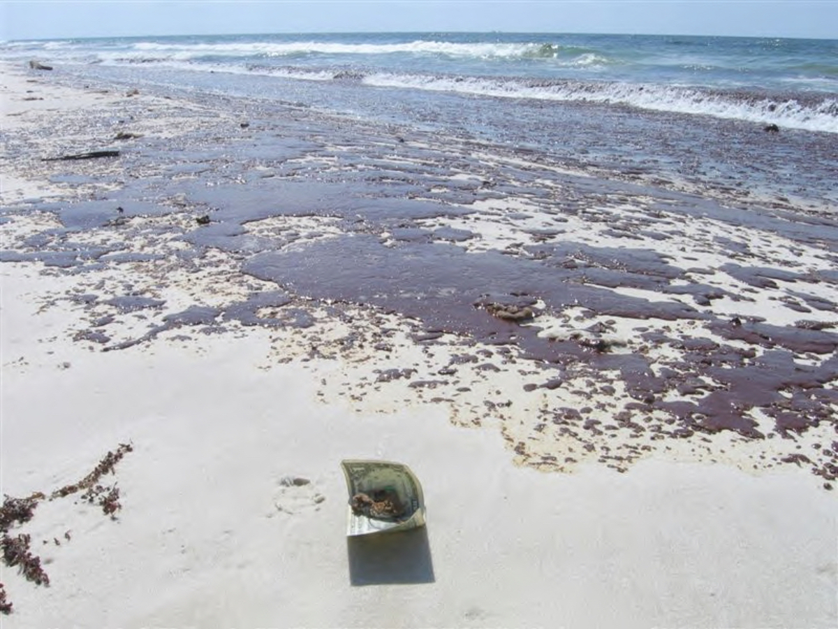 A dollar is placed next oil washed up on the beach at Bon Secour National Wildlife Refuge to provide perspective. Oil began hitting the shores of Bon Secour in the late morning of June 11th.