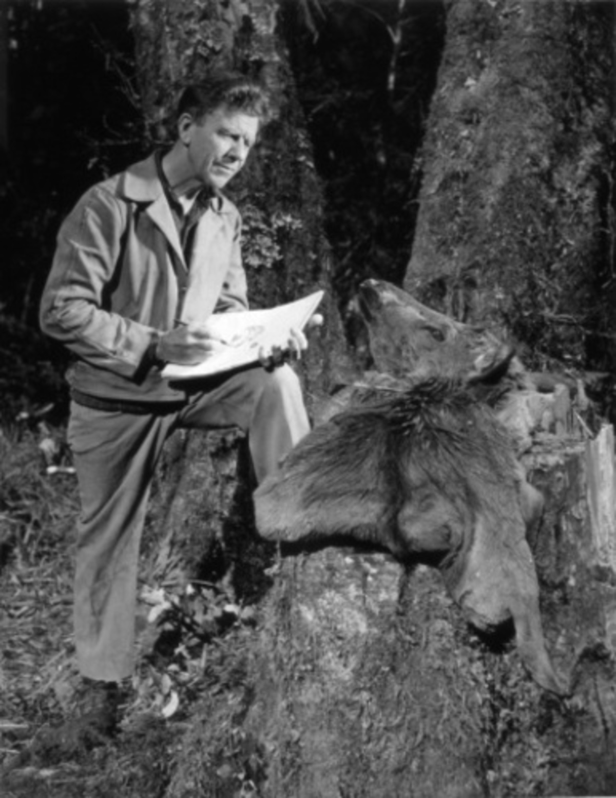 Olaus Murie sketching anatomical features of a Wapiti specimen, Fiordlands, New Zealand, 1949. Environmental Sciences; New Zealand;