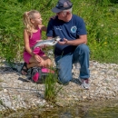 Older man and young girl look at rainbow trout