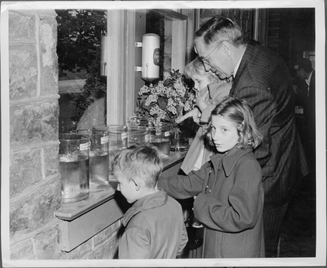 Open house at Leetown Fish Cultural Station. Dr. Jim Gutsell, a member of the laboratory staff, has a busy day with his tour of the exhibits, and here is shown describing some of the fishes to the youngsters.