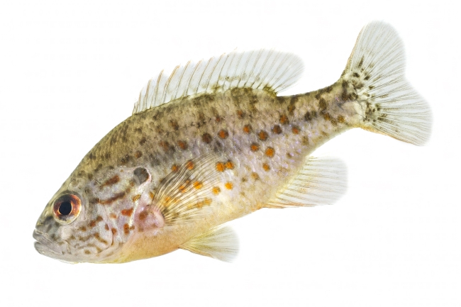 The orange spotted sunfish is a small fish with an intermediate size mouth that extends to the front edge of the eye. The sides of the male are a metallic blue with orange spots scattered across its sides and cheeks. They also often have 3-6 silvery vertical bars on their sides.