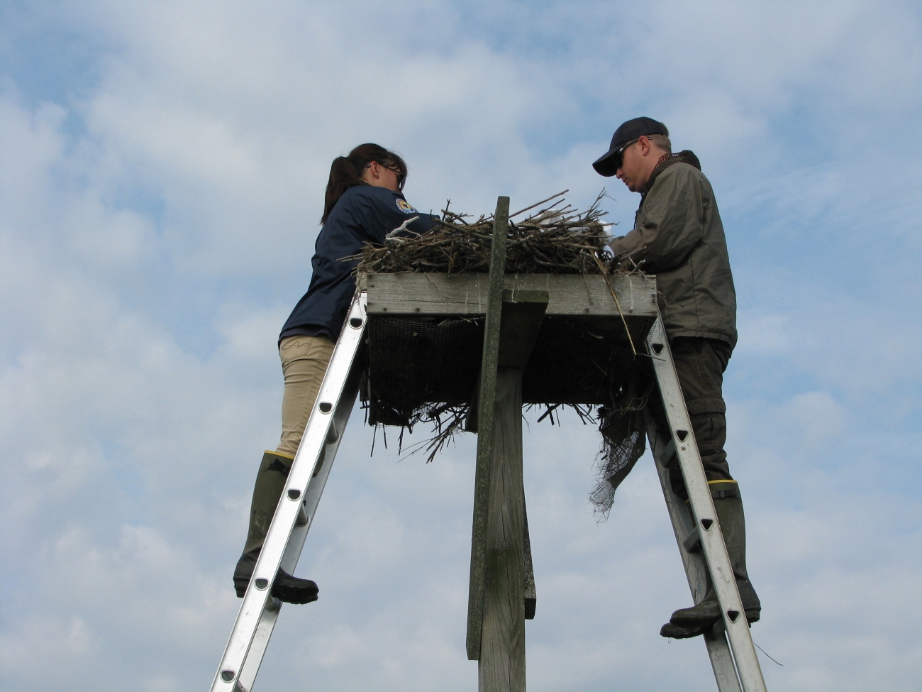 Forsythe interns and volunteer Osprey chick banding with one of the parents flying in the background.