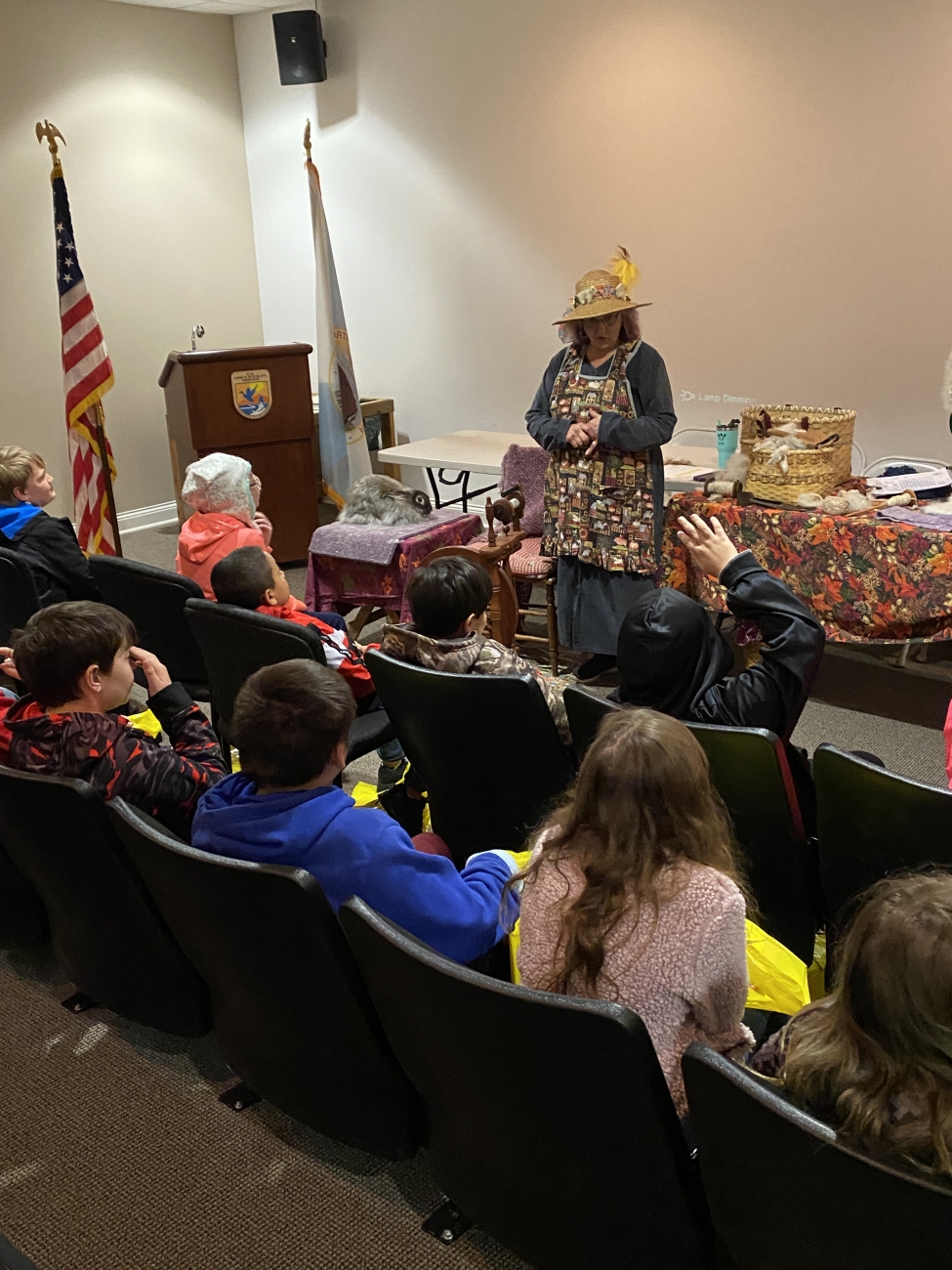 Students listen as Sue Duncan talks about how clothing was made long ago.