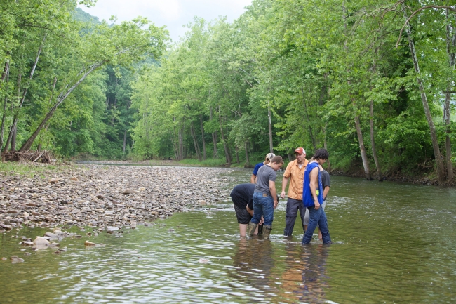 School children test water quality chemistry/survey macroinvertebrates at Seneca Rocks, WV.