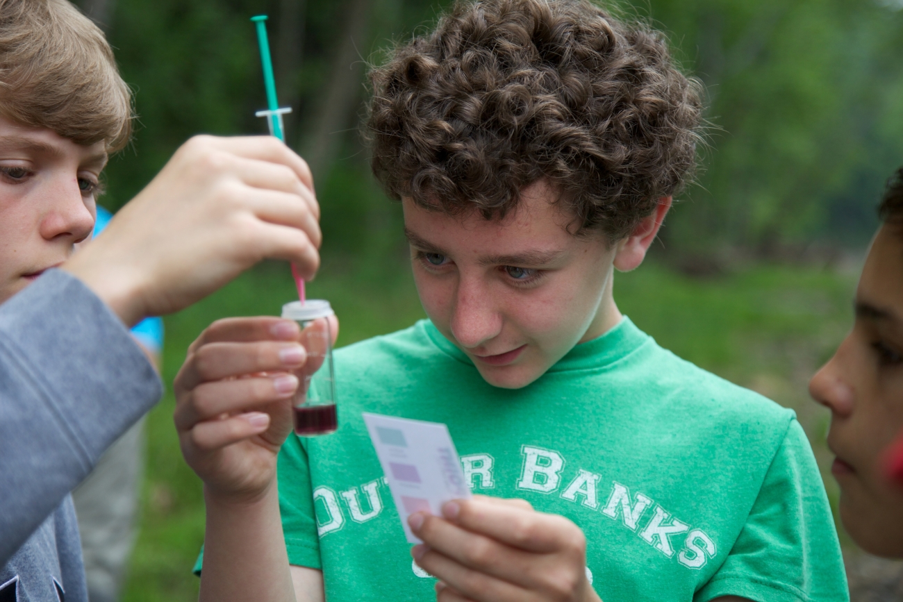 School children test water quality chemistry/survey macroinvertebrates at Seneca Rocks, WV.