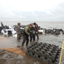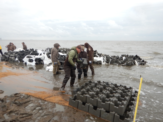 Workers install oyster castles at Gandy's Beach in New Jersey to restore the shoreline after it took a pounding from Hurricane Sandy. The oyster castles improve coastal resilience, protect the coast against erosion while introducing new habitat for water-filtering oysters.