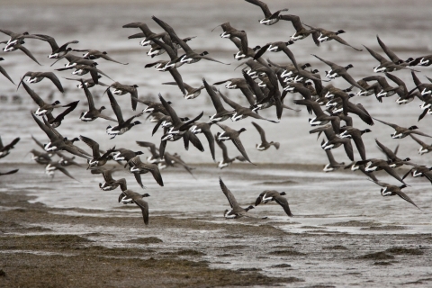 Izembek National Wildlife Refuge lies between the highly productive waters of the Bering Sea and the Gulf of Alaska. Within the heart of the Refuge is Izembek Lagoon, a 30-mile long and 5-mile wide coastal ecosystem that contains one of the world's largest eelgrass (Zostera marina) beds. More than 200 species of wildlife and nine species of fish can be found on the Refuge. Millions of migratory waterfowl and shorebirds find food and shelter in the coastal lagoons and freshwater wetlands on their way to and from their subarctic and arctic breeding grounds. This extraordinary abundance and diversity of waterfowl has attracted international attention. In 1986, Izembek National Wildlife Refuge and Izembek State Game Refuge, which encompasses the submerged land of Izembek Lagoon, was the first wetland area in the United States to be recognized as a Wetland of International Importance by the RAMSAR Convention. In 2001, Izembek Refuge was also designated as a Globally Important Bird Area by the American Bird Conservancy.