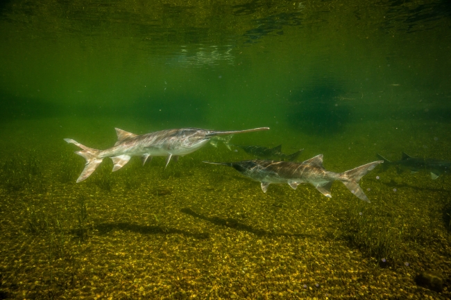 The paddlefish is a species of concern native to the Missouri, Ohio, and Mississippi Rivers. Paddlefish numbers have dropped in recent years due to dam construction, dredging, and over fishing in many areas.